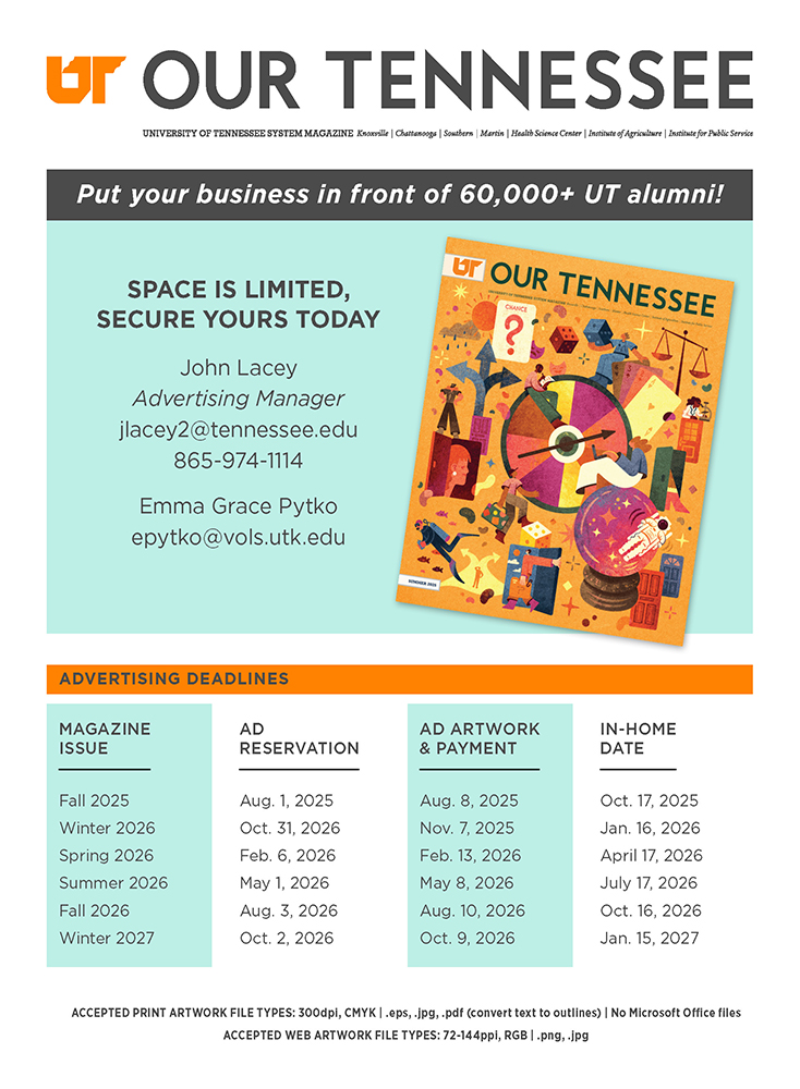 Our Tennessee is the flagship publication of the University of Tennessee System, including campuses at Knoxville, Chattanooga, Pulaski and Martin; and the UT Health Science Center based in Memphis. Our Tennessee offers advertisers the only opportunity to directly reach the smart, affluent decision makers that comprise the UT alumni community.